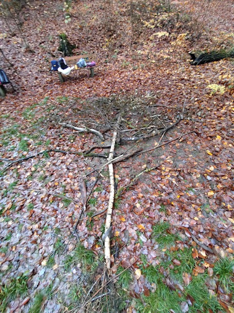 Im Wald angekommen, durften die Kinder zunächst ihr eigenes Waldsofa bauen – ein gemütlicher Platz aus Ästen, Blättern und Moos, der später zum Ausruhen und Besprechen diente. Anschließend gingen alle neugierig auf Entdeckungstour: Es wurden Blätter, Früchte und andere Schätze des Waldes gesammelt und gemeinsam betrachtet.
